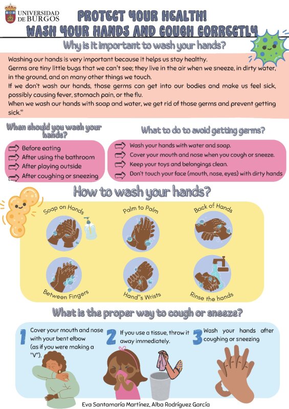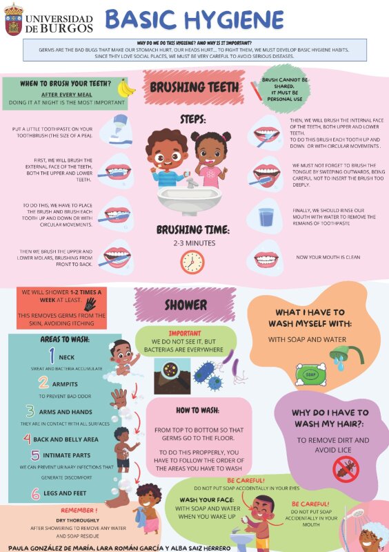 Las estudiantes de enfermería de la Universidad de Burgos que participaron el año pasado están desarrollando, como Trabajo de Fin de Grado, tres intervenciones de educación en salud sugeridas por la Kyoga Foundation, nuestra organización colaboradora en Uganda. Estas intervenciones se centran en la promoción de la lactancia materna, la educación bucodental y la reducción de la mortalidad infantil. También llevamos infografías en inglés, elaboradas por estudiantes de enfermería de la Universidad de Burgos, con temas propuestos por los profesores ugandeses para explicar distintos aspectos sanitarios a los niños y niñas.