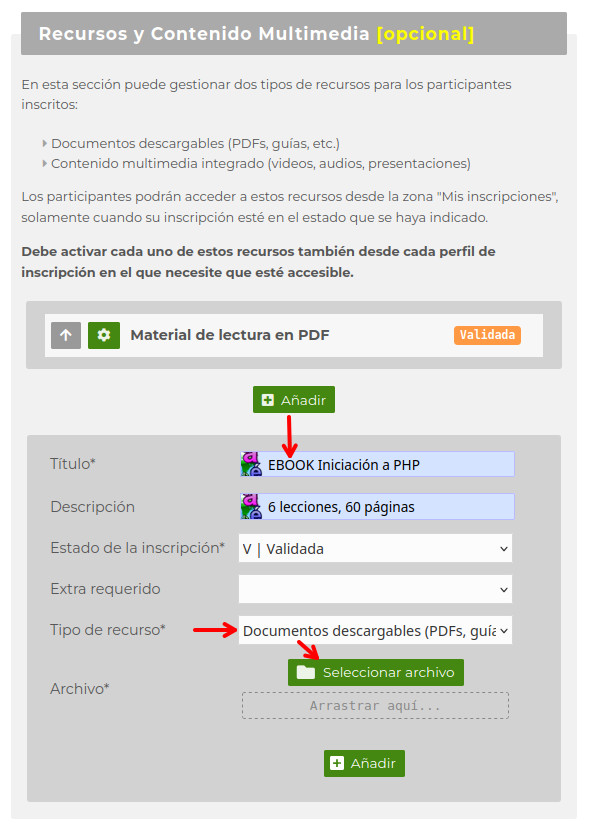 💡 Consejo: Rellena el Título con algo claro y específico. Por ejemplo: "EBOOK: Introducción a PHP" en lugar de solo "Material". Tus estudiantes lo verán en su lista de recursos.