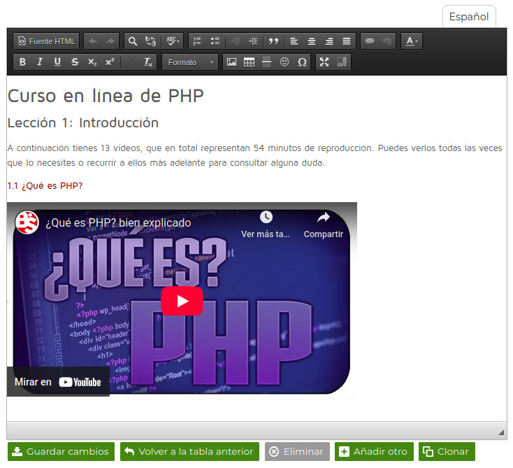 - Si el tipo de contenido que has escogido era "Contenido HTML" entonces serás redirigido a una segunda página con un editor HTML WYSIWYG para elaborar el contenido HTML multimedia de esa lección a tu gusto.