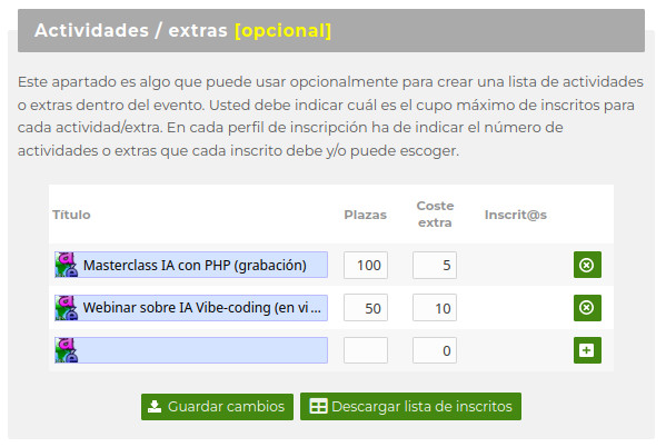- indica un "Coste extra" que incrementará el precio de la inscripción de los alumnos que escojan este EXTRA (puedes poner un 0)