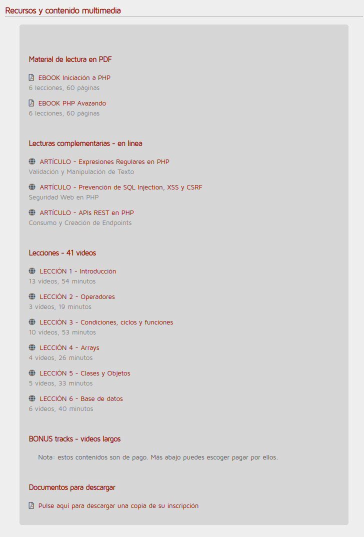 - (Opcional) Cuenta en plataforma de vídeos (YouTube, Vimeo, etc.) si incluirás lecciones con videos