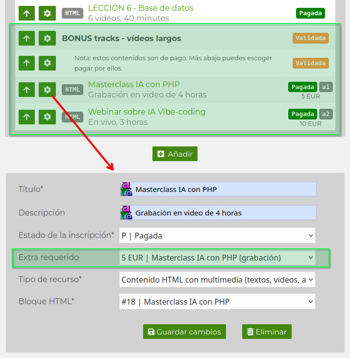 2. cuando agregues las lecciones avanzadas, indicarás que se requiere que el alumno haya pagado por el EXTRA A) de 20€