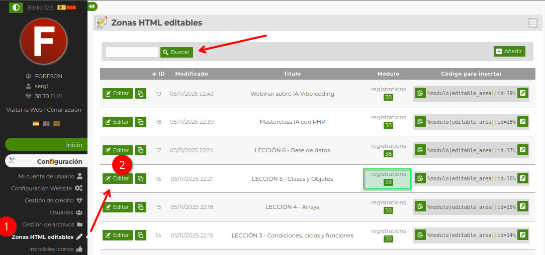 ℹ️ Estos contenidos HTML se van creando en lo que se llama el listado de "Zonas HTML editables" del sistema, en donde puedes encontrarlos siempre y editarlos directamente aquí. Fíjate que en la columna "Módulo" se indica "registrations" ("inscripciones") y el número del evento ("38" en este caso). Aunque de hecho, puedes reaprovechar una de estas zonas para más de un evento!