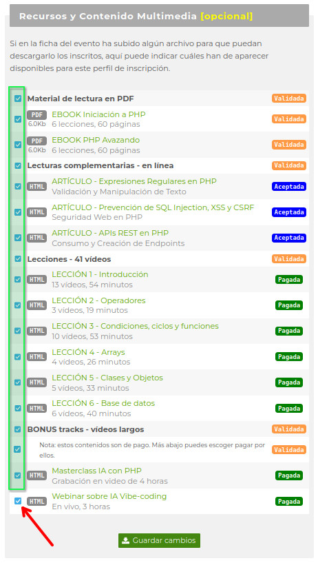 ℹ️ Nota: un contenido del tipo DESCARGABLE o HTML que indiques que REQUIERA EL PAGO DE UN EXTRA, se mostrará sí o sí a los alumnos AUNQUE el alumno NO haya pagado por el EXTRA requerido! Esto se hace para que dejarles abierta la puerta de que al verlo, finalmente pueda interesarles y pagar por él. Por de pronto, si no pagan el EXTRA entonces lo verán listado, pero no podrán descargarlo o visualizarlo.